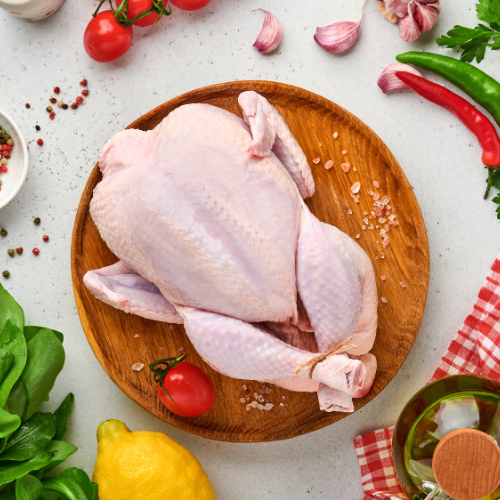 עוף שלם, טרי ואיכותי, מתאים לצלייה שלמה בתנור, לבישול תבשילים או לחלוקה לחלקים לפי הצורך.