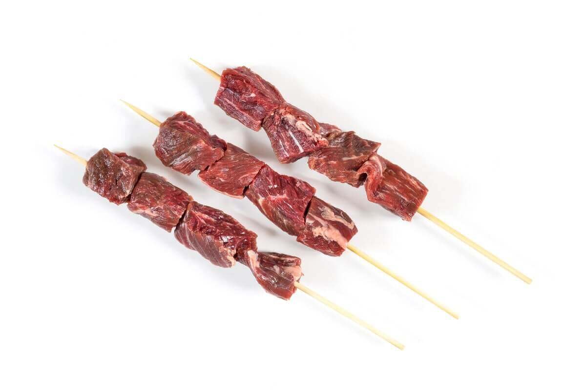 שיפודי יקיטורי קצרים עם נתחי קצבים מובחרים, במשקל של 30–40 גרם לשיפוד.